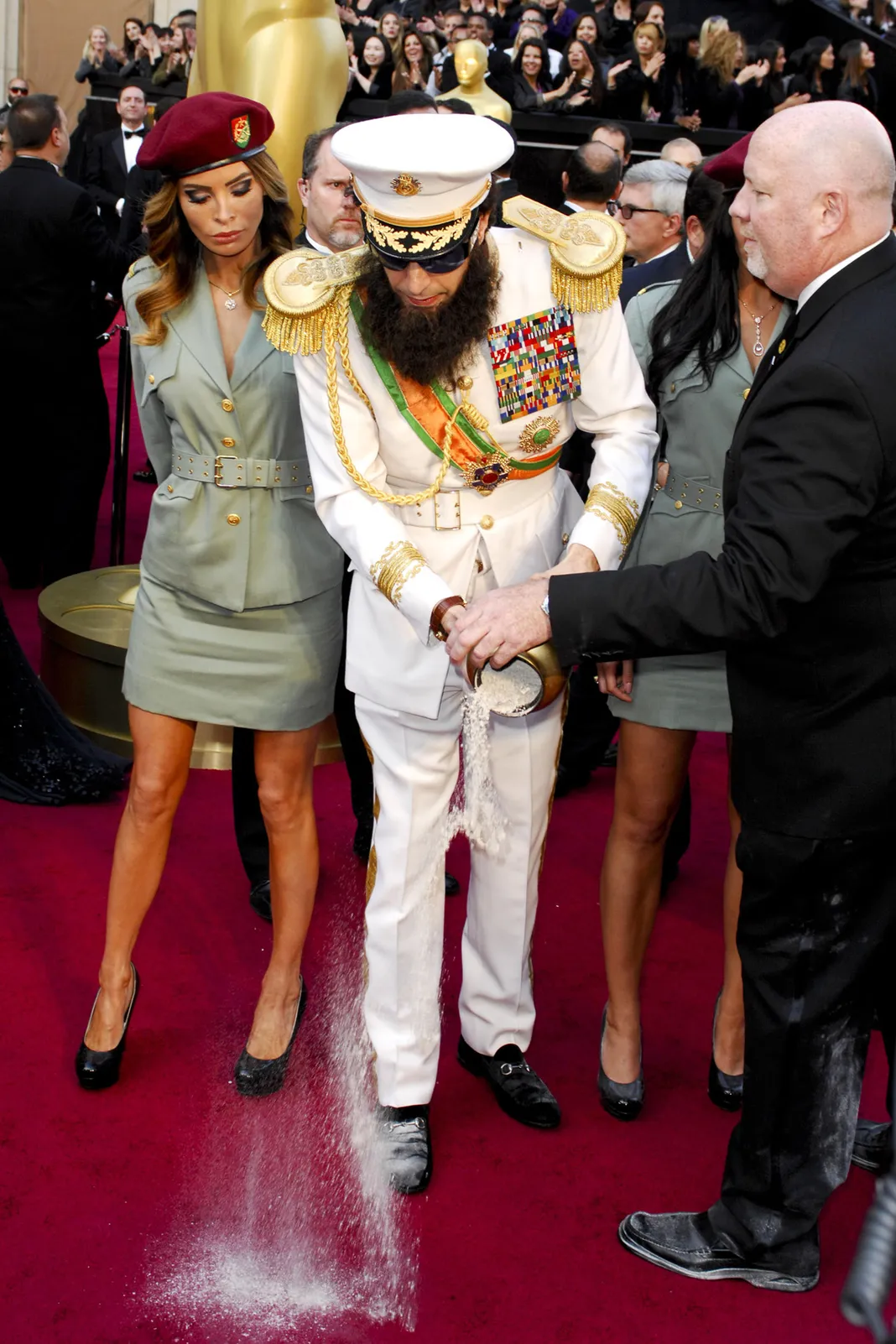 In a complete a-hole move, Sacha Baron Cohen, known for his ridiculous stunts and characters threw an urn full of fake ashes all over Ryan Seacrest. It was super lame and there was no reason for it. Suffice to say, all it did was make Cohen look like a huge jerk.