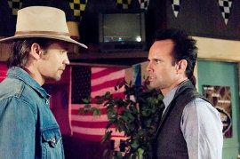 Raylan Givens (Timothy Olyphant) and Boyd Crowder (Walton Goggins) may have had the same objective over the last few weeks — that is, find Drew Thompson — but throughout most of this madcap fourth season, Justified's two dashing leads have been...