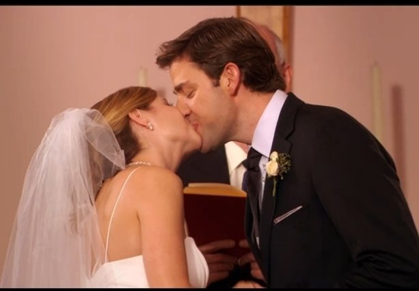 They have a couple of them. Their first lip lock — after Jim finally declared his love for Pam and went for it with a lovely, unexpected kiss — was the cliffhanger kiss to end them all. Their wedding kisses (both the one on the Niagara Falls boat and back at the church) were just as wonderful and romantic.