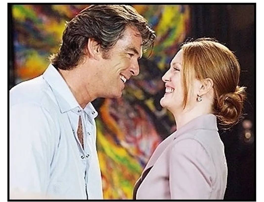 Moore has so far been the queen of torment specializing in women who’ve suffered from maladies ranging from cocaine addiction (Boogie Nights) severe environmental allergies (Safe) and repressed lesbianism (The Hours). Maybe she wanted to take a vacation from the dark side by tackling a character who’s biggest problem is her Cheetos consumption but more likely she thought playing (gasp!) funny would further prove her acting mettle. But getting laughs is a lot tougher than it looks if you’re good and really really tough looking if you’re not. Awkwardly stumbling through this fifth-rate screwball comedy Moore is positively tragic thudding out one-liners with the grace of a wounded deer. The breezy Brosnan fares better only because his ingratiating lilt and calm demeanor makes him at least charming though when in one “funny” scene he picks a fleck of food off her face puts in his mouth and utters the name of a Hostess product (“Snowball…”)–even he can’t make that sexy.