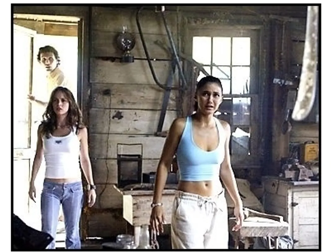 “Maybe I need to remind you of a little movie called Deliverance ” one of the film’s protagonist tells his girlfriend after she suggests knocking on the door of a mountain cabin they have just stumbled upon. How they got there however was not exactly the accident it appears to be. Jessie (Eliza Dushku) and her four friends are heading up to West Virginia for a weekend of camping when their SUV’s tires blew out on a dirt road. Solo motorist Chris (Desmond Harrington) is distracted by road kill and slams into their truck. In usual slasher fashion the group splits up: two (Kevin Zegers and Lindy Booth) stay at the scene of the accident while the other four go off into the woods looking for help. This is when the foursome out of desperation enters the seedy cabin–a decision they will soon regret. The dilapidated place is filled with old junk including broken doll parts and rusty old music boxes but what they find in the fridge not to mention the bathtub tells them they should scram. But before they can open the front door they spot the cabin’s inhabitants approaching and are forced to take refuge under a bed where they witness three gruesome mountain men perform unspeakable acts. Their aim is to get out of the cabin alive and out of the woods–for good.